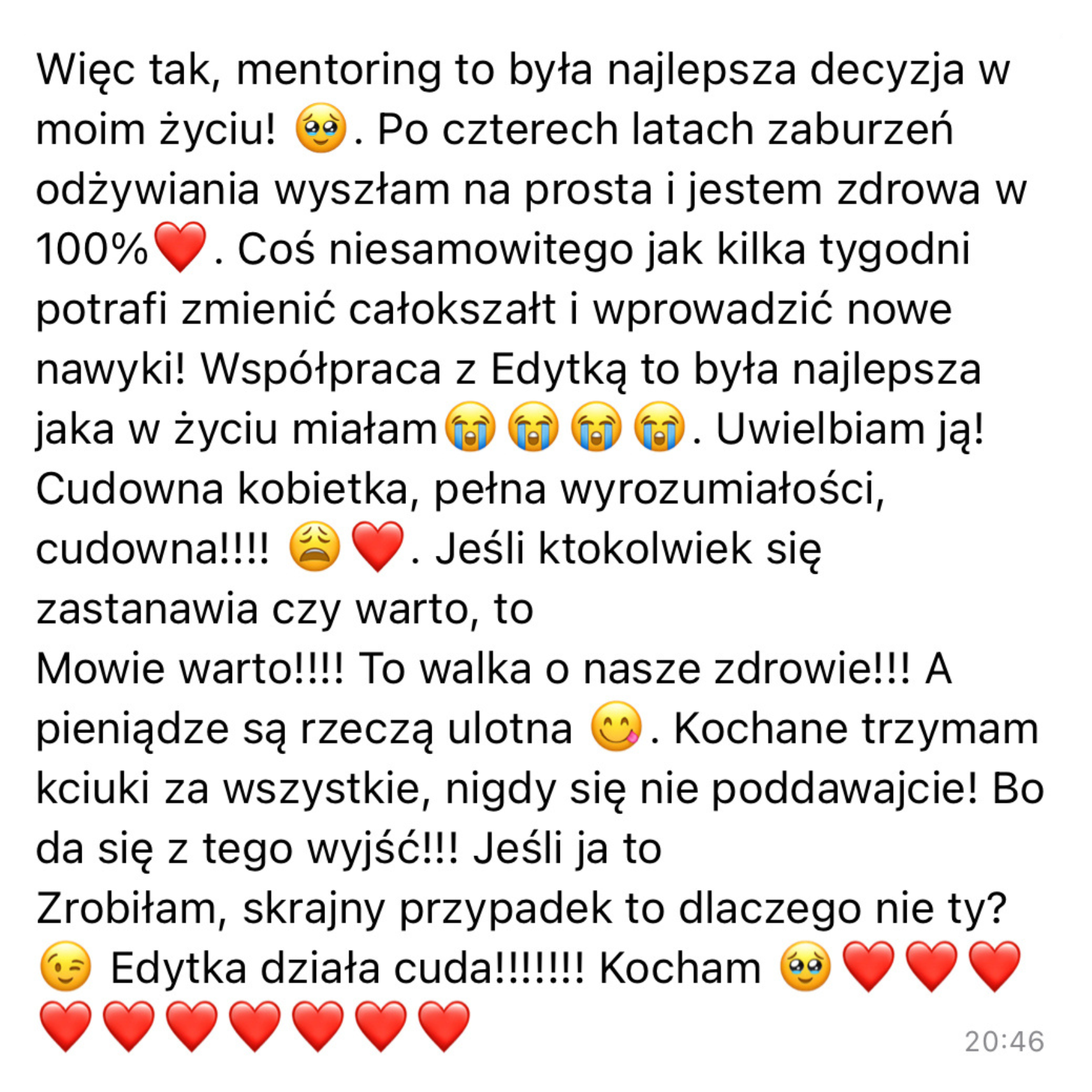 Dzięki codziennemu kontaktowi razem przejdziemy przez ten proces. JESTEM w nim DLA CIEBIE. Prowadzę Cię za rękę, od momentu totalnego zagubienia jedzeniowego do wolności i lekkości jedzeniowej. Widzę Cię i słyszę twoje pragnienia bo sama wiele lat miałam bulimię, ortoreksję i objadałam się, dlatego teraz tak dobrze i bez słów rozumiem moje podopieczne.