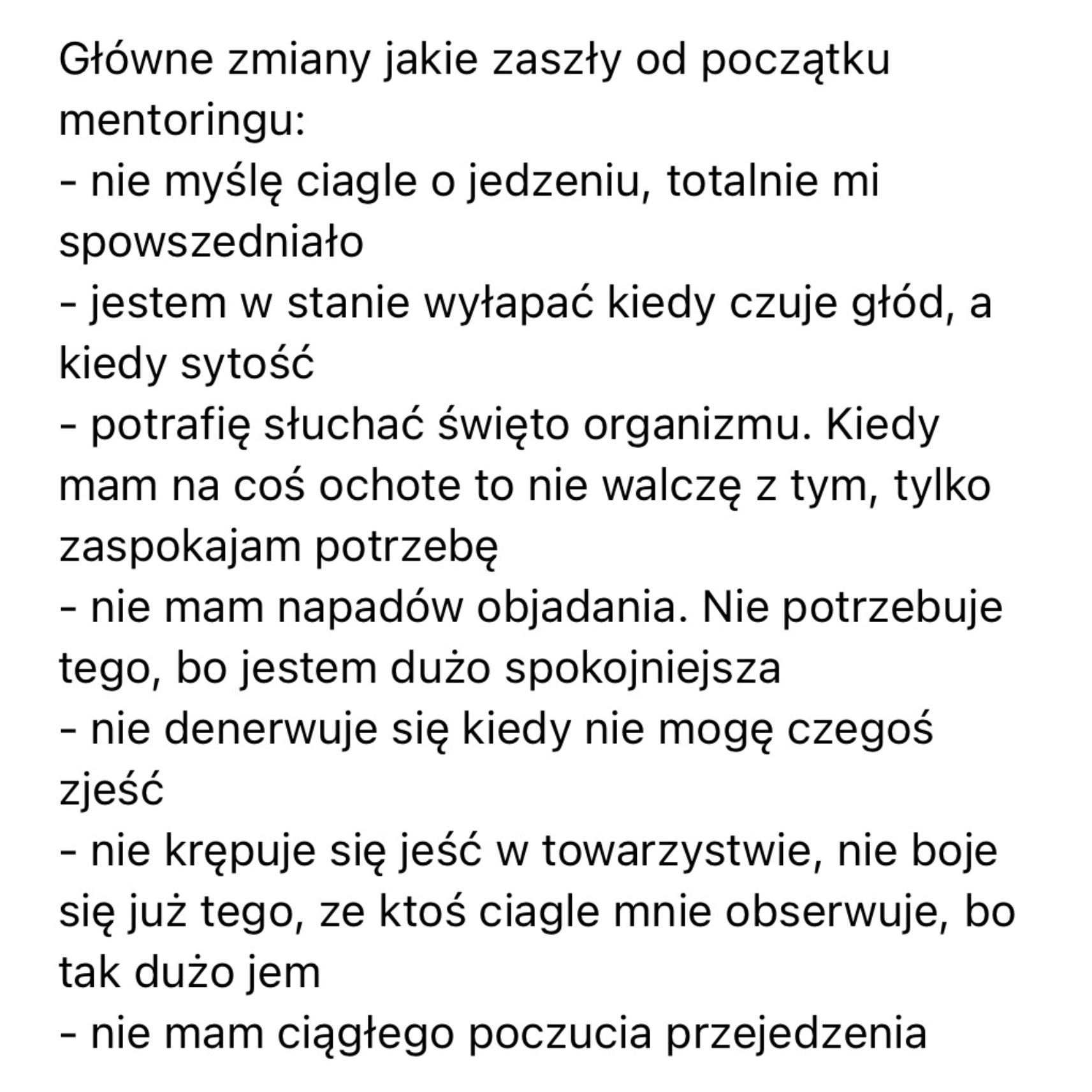 Wiem, że najbardziej na świecie boisz się, że przytyjesz. Ale zastanów się – tyje się od nadwyżki kalorycznej a jeśli nie będziesz miała napadów objadania i utrat kontroli w procesie jedzenia, bo to właśnie adresujemy na mentoringu – to nie będzie też nadwyżki kalorycznej. Więc skąd ma się brać tycie?