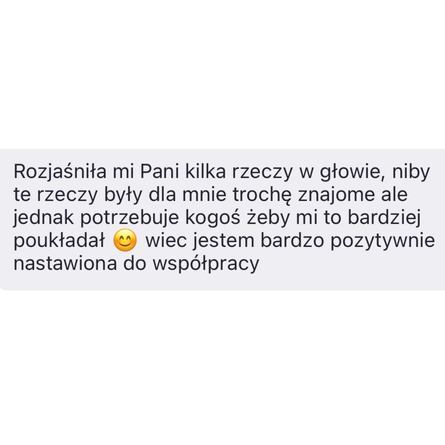 - Jesteśmy ze sobą w codziennym kontakcie od poniedziałku do piątku poprzez komunikator WhatsApp lub Zoom. Jestem dla Ciebie dostępna w wiadomościach prywatnych. Możesz zadawać tyle pytań ile tylko chcesz - bez ograniczeń a ja służę Ci swoją wiedzą i doświadczeniem. Masz mnie na wyłączność.