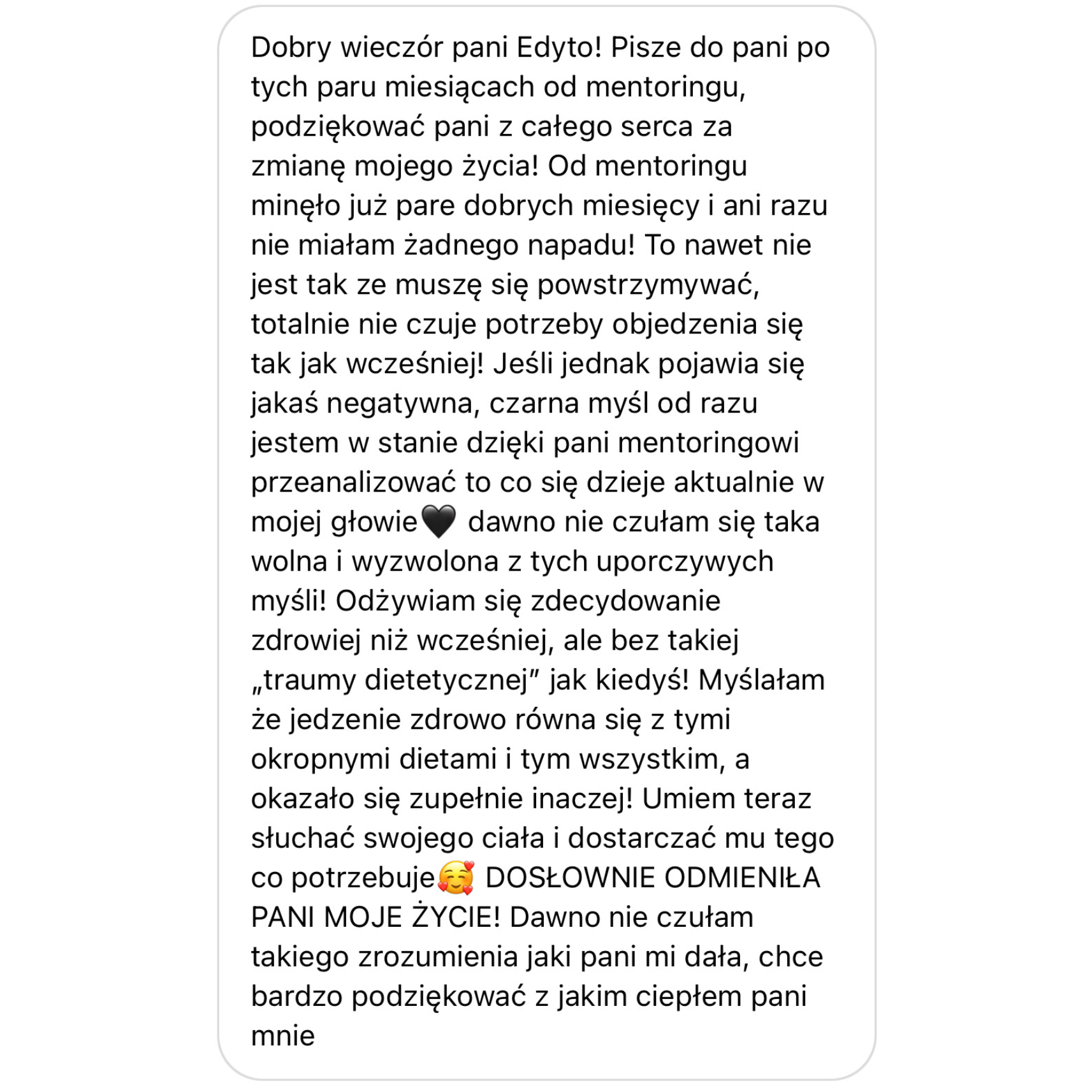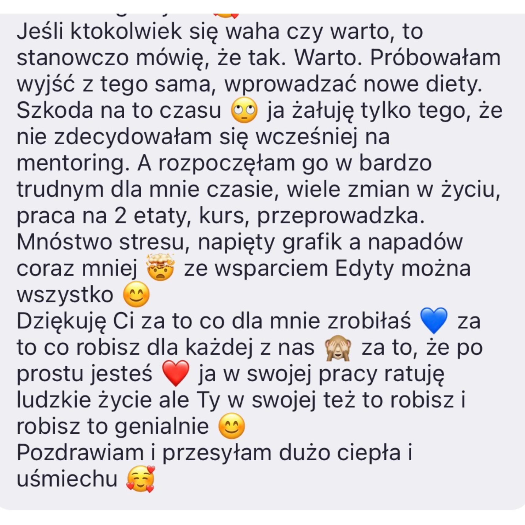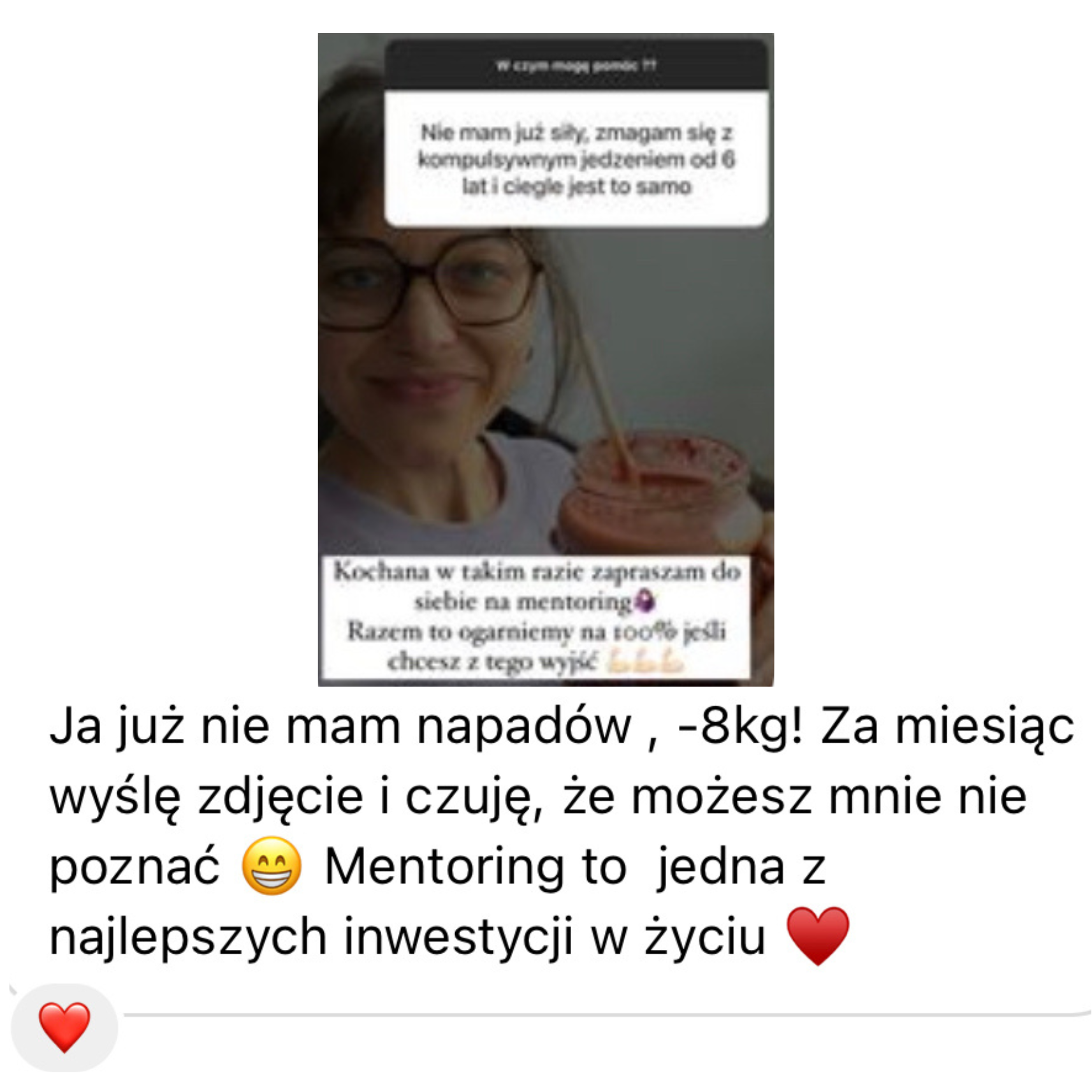 Często moje klientki do mnie piszą, że jestem ich ostatnią deską ratunku obawiając się, że nie ma już dla nich nadziei. Też tak myślałam wiele lat, kiedy mierzyłam się z napadami objadania, dlatego doskonale Cię rozumiem. Chcę Cię zapewnić, że dzięki mentoringowi zaczniesz podejmować inne wybory wokół jedzenia, a skutki tych decyzji będą zupełnie odwrotne od tych, których doświadczasz teraz.